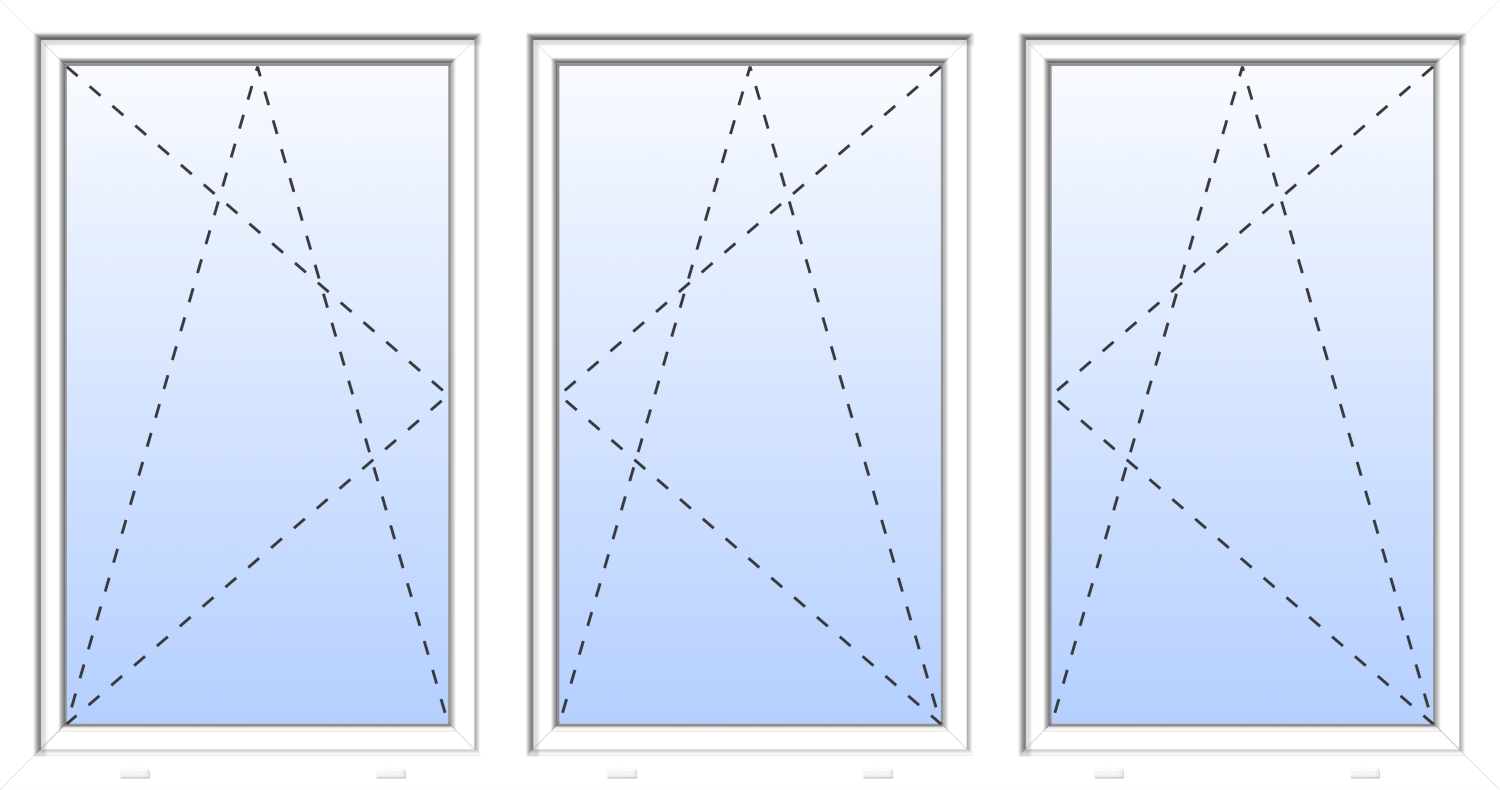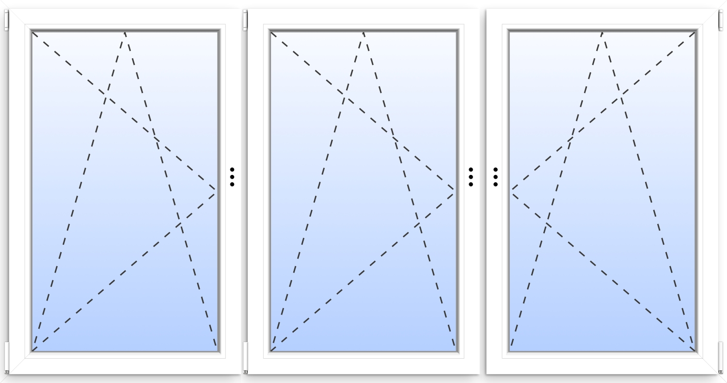 ✓ symmetrisches Fenster mit festen Pfosten ✓ 2-fach Verglasung ✓ Teilung 1/3 zu 1/3 zu 1/3 ✓ Öffnung aller Flügel möglich ✓ Dreh-Kipp