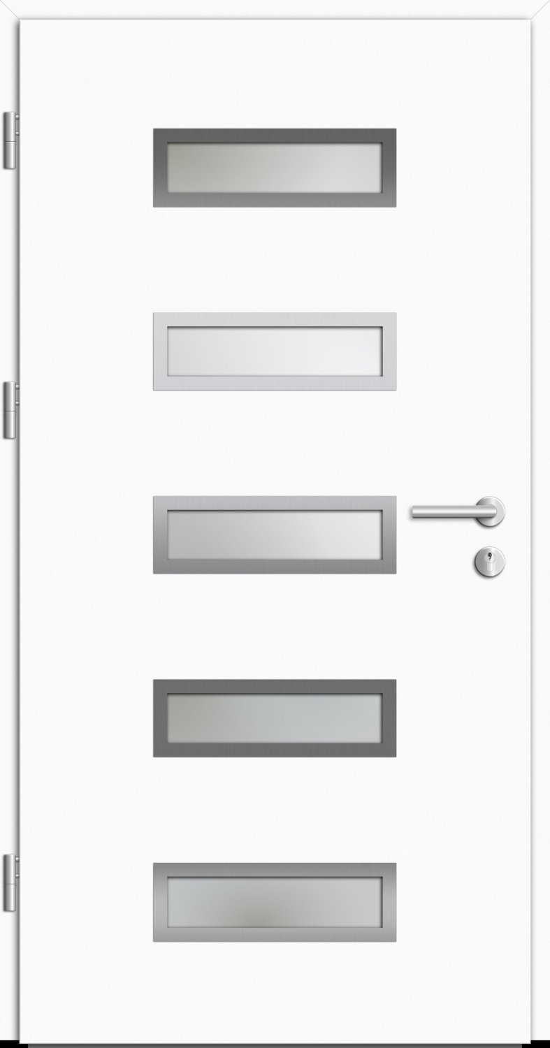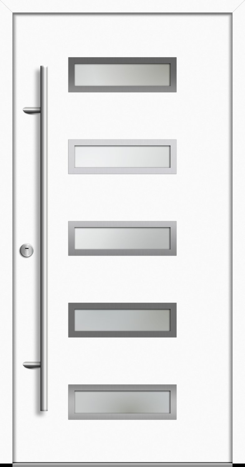 Außenansicht Aluminium Haustür mit Satinatoglas (Milchglas) mit Klarglasstreifen Reinweiß