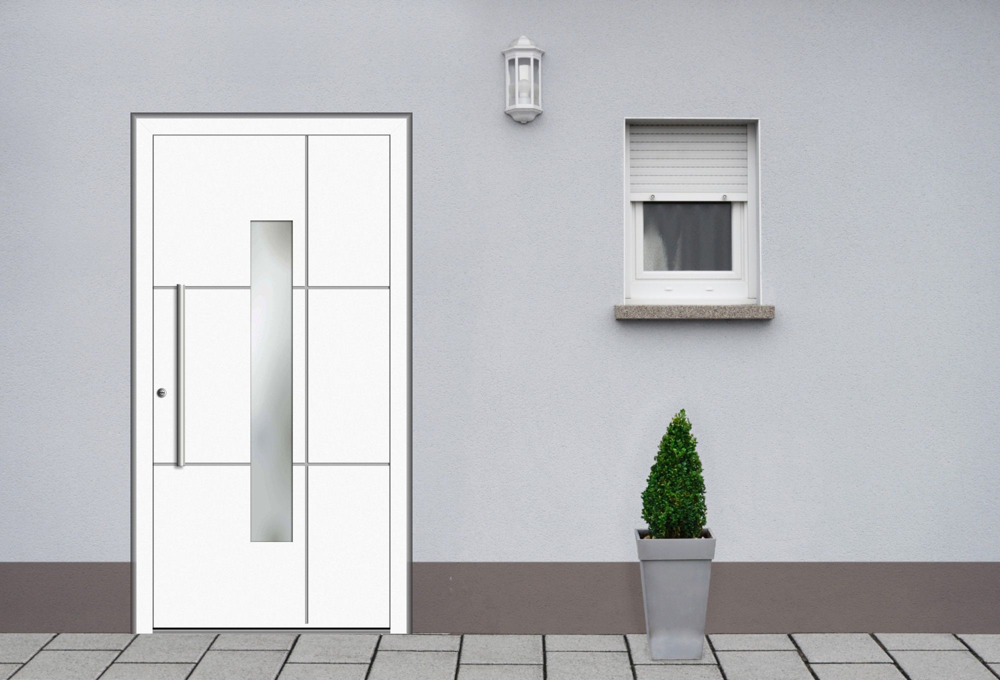 Die Aluminium Haustür "ROMINA" 75 mm SCHÜCO PRO RC2 steht für Eleganz, Funktionalität und Sicherheit! Mit diesem Modell sichern Sie sich einen treuen Begleiter für Ihren Hauseingang. Konfiguriert werden kann die ALU Haustür "ROMINA" 75 mm SCHÜCO PRO RC2 in Ihrer Wunsch-RAL-Farbe. Oder wählen Sie aus den Standardfarben Verkehrsweiß, Anthrazitgrau, Moosgrün, Purpurrot, Stahlblau, Wunsch-RAL-Farbe, Sepiabraun oder Graubeige. Um in Puncto Sicherheit einen Einbruchschutz der Widerstandsklasse RC2 zu erzielen, sind in der SCHÜCO Haustür ROMINA eine 3-fach Schwenkhakenverriegelung oder 3-fach Schwenkhakenverriegelung mit Automatikschloss verbaut. Ergänzt wird die Verriegelung um eine Aushebelsicherung und optional E-Öffner mit Tagesfalle. Dank Ihres Aufbaues erzielt das Modell einen sehr guten Wärmedämmwert von 0,91 W/m²K. Zudem lässt sich das Modell cm-genau auf Maß bestellen. Wählen Sie eine individuelle Breite von 90 cm - 115 cm und eine Höhe zwischen 190 cm - 225 cm. Die eingebauten Glasflächen in Satinato (Milchglas) schaffen Tageslicht in Ihrem Hauseingang und halten gleichzeitig unerwünschte Blicke ferne. Mit Ihrem modernen Design mit eingelassenen Nuten, lässt die ALU Haustür "ROMINA" 75 mm SCHÜCO PRO RC2 Ihren Hauseinang in neuem Glanz erstrahlen!
