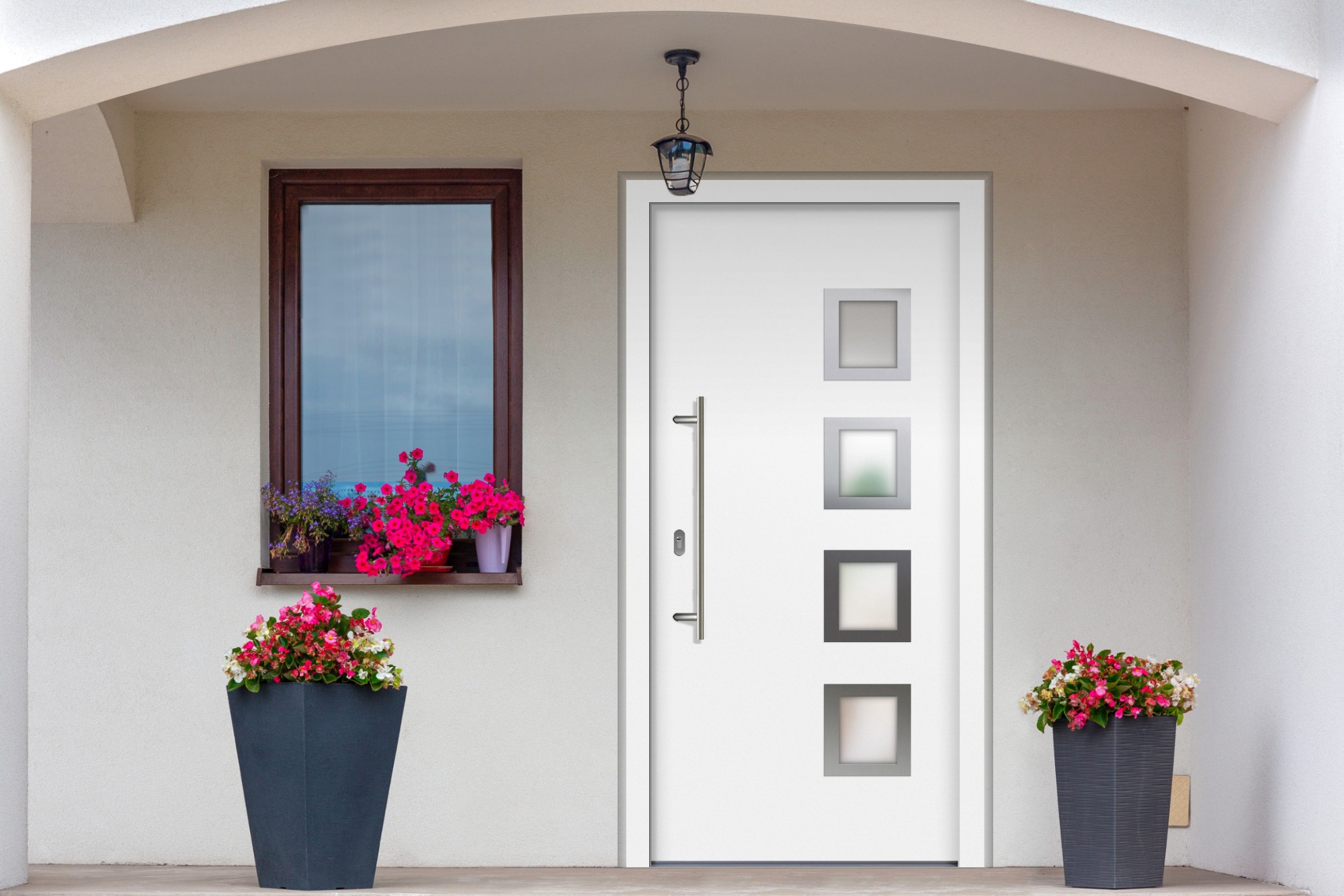 Eine Haustür, die durch sichere Ausstattung, gute Wärmedämmung und eine ansprechende Optik überzeugt. Unsere Aluminium-Kunststoff Haustür "LISELOTTE" 71 mm flügelüberdeckend wird aus dem hochwertigen Materialverbund Kunststoff-Aluminium gefertigt. Ihre 50mm wärmegedämmte Sandwichfüllung, gepaart mit einem stahlverstärktem Flügel und einer 3-fach Schwenkhakenverriegelung, sorgen für Stabilität und Sicherheit. Der attraktive Glaseinsatz wird in einem 3-fach Satinato (Milchglas) gefertigt. Dies schafft besonders in fensterlosen Hauseingängen eine zusätzliche Lichtquelle. Ihnen stehen im Konfigurator verschiedene Griffsets und passendes Zubehör zur Auswahl. Bestellen Sie sich das Modell ALU-PVC Haustür "LISELOTTE" 71 mm im modernen Verkehrsweiß oder Anthrazitgrau und bestimmen Sie cm-genau das Maß Ihrer neuen Haustür!