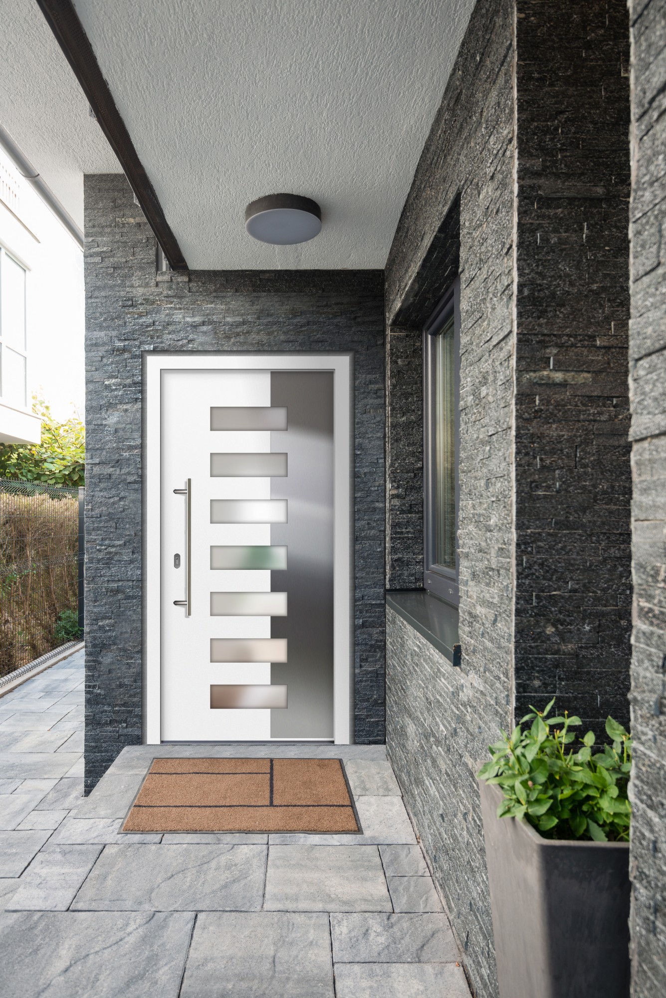Die Aluminium-Kunststoff Haustür "SAMANTHA" 71 mm flügelüberdeckend überzeugt durch gute Dämmwerte, sichere Verriegelung und ein ansprechendes Erscheinungsbild. Die 50mm wärmegedämmte Sandwichfüllung sorgt zusammen mit einem stahlverstärkten Flügel und einer 3-fach Schwenkhakenverriegelung für Stabilität und Sicherheit. Die schicke Verglasung wird in einem 3-fach Satinato (Milchglas) gefertigt. Dies sorgt besonders in fensterlosen Hauseingängen für eine zusätzliche Lichtquelle.Ihnen stehen im Konfigurator verschiedene Griffsets und passendes Zubehör zur Auswahl. Bestellen Sie sich das Modell ALU-PVC Haustür "SAMANTHA" 71 mm im modernen Verkehrsweiß oder Anthrazitgrau und bestimmen Sie cm-genau das Maß Ihrer neuen Haustür!