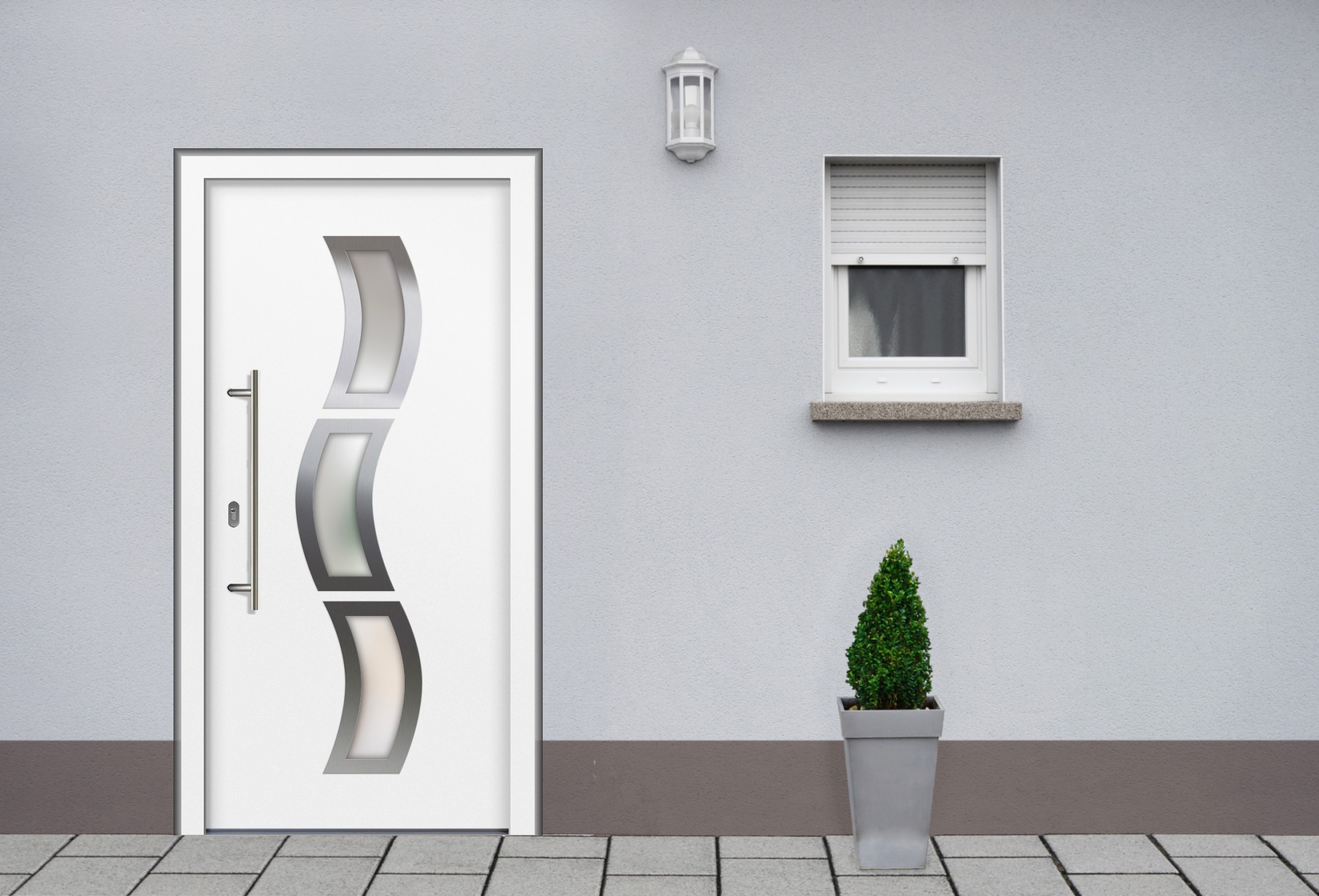 Eingangsbereich mit Fenster und Haustür mit Edelstahl-Applikationen