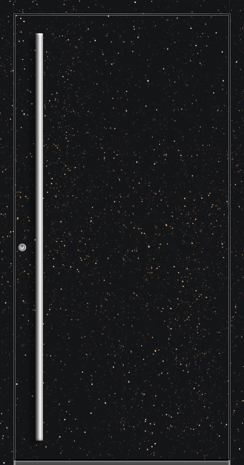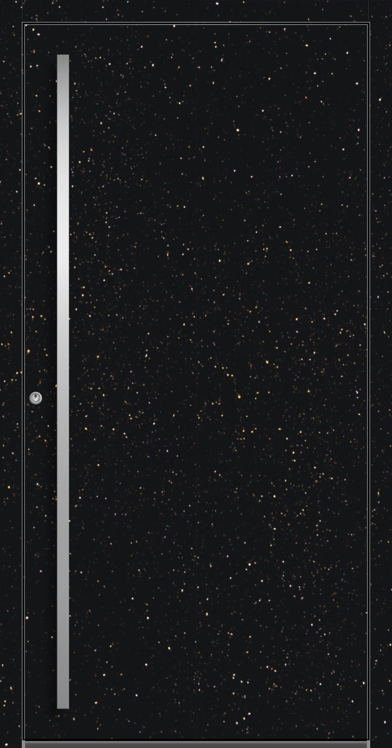 Die exklusive Haustür VALERIA vereint modernes Design mit natürlicher Eleganz. Sie besteht aus stabilem Aluminium und echtem Granitstein Star Galaxy. Jede Tür ist ein handgefertigtes Unikat, das langlebig, sicher und stilvoll ist. Gefertigt wird sie mit modernster Technologie und Handwerkskunst Made in Germany auf dem Pirnar PREMIUM CarbonCore Profilsystem. Ausgestattet mit einem integrierten Obertürschließer, schließt die Tür sanft, sicher und kontrolliert. Die Tür bietet eine erstklassige Wärmedämmung von 0,75 W/m²K, spart Energie und sorgt für ein angenehmes Raumklima. Die RC2-Widerstandsklasse garantiert geprüften Schutz gegen Einbruchsversuche. Der Naturstein Star Galaxy, sorgt dank seiner dynamischen Musterung, für ein einzigartiges und unverwechselbares Erscheinungsbild. Ein massiver Stoßgriff ist inklusive, verdeckt liegende Bänder sorgen für ein puristisches, elegantes Erscheinungsbild. Optional kann die Tür mit Fingerscanner oder APP-Steuerung ausgestattet werden – für maximalen Komfort und Smart-Home-Kompatibilität. Die widerstandsfähige Oberfläche ist UV-beständig, kratzfest und wetterresistent, bleibt dauerhaft makellos und ist pflegefrei. Verschiedene Verriegelungssysteme, von 3-fach bis 5-fach Schwenkhakenverriegelung, mechanisch oder elektrisch, runden die hohe Sicherheit ab. Die exklusive Haustür Aluminium-Stein Haustür "VALERIA" 83 mm RC2 STAR GALAXY bietet Design, Funktion und Schutz auf höchstem Niveau – perfekt für einen langlebigen, eindrucksvollen Eingangsbereich.
