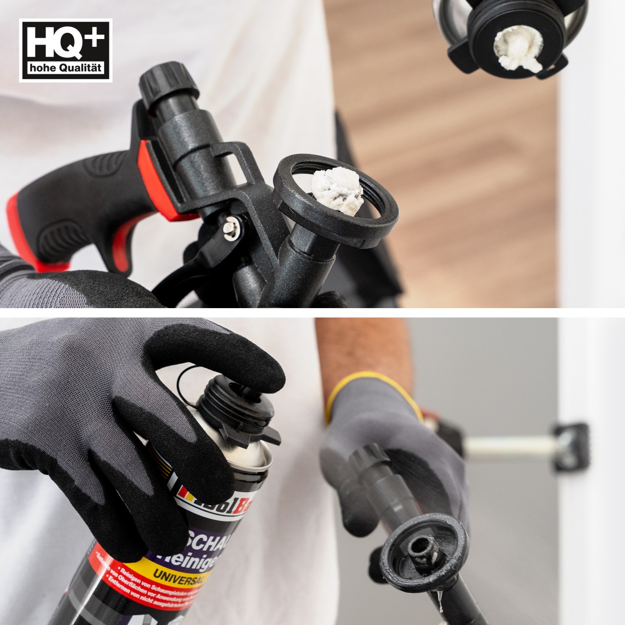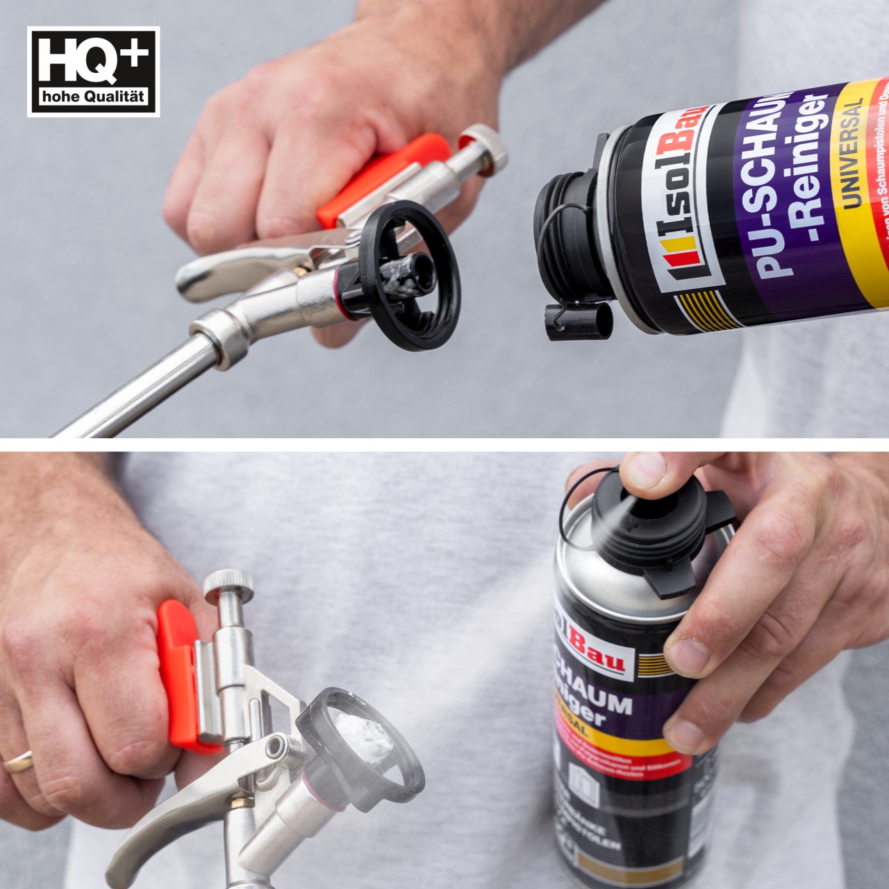 Reinigung der Pistole: Pistole vom PU-Schaum-Gebinde trennen und die im Gerät verbliebenen Schaumstoffreste durch das Drücken des Abzugshebels entfernen. Den Sprühkopf auf das Ventil des PU-BAUSCHAUM-ENTFERNERS aufsetzen und den Anschlussadapter besprühen. Den Sprühkopf abnehmen und den PU-SCHAUMREINIGER in den Anschlussadapter einstecken, dann den Abzugshebel erneut drücken. Diesen Schritt bis zur vollständigen Reinigung der inneren Pistolenbereiche vom PU-Schaum wiederholen. Alle gereinigten Flächen gründlich trocknen.