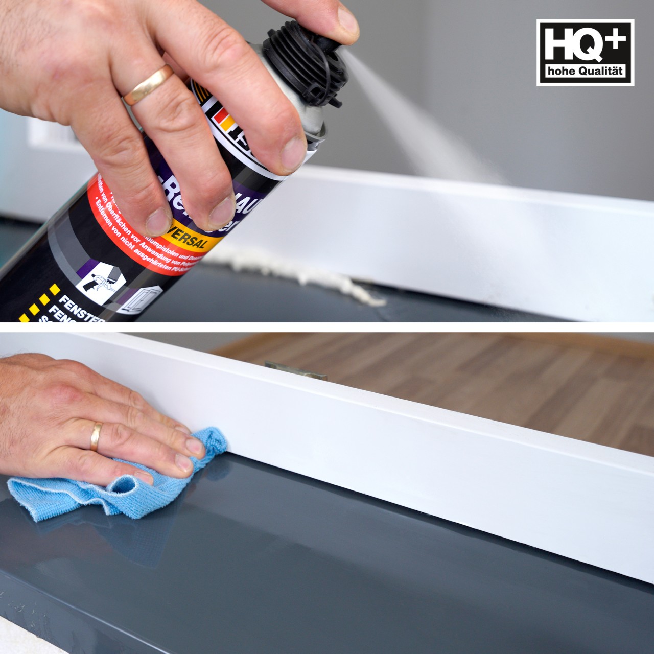 VERARBEITUNG: Reinigung der Oberfläche: Den beigefügten Sprühkopf auf das Ventil des PISTOLENREINIGERS aufsetzen. Mit PU-Schaumstoff oder -Kleber frisch verschmutzte Bereiche besprühen. Wird der verschmutzte Auslauf eines PU-Schaum-Gebindes gereinigt, ist der PU-REINIGER auf das Ventil und den Pistolenadapter genau aufzubringen. Stoffreste mit einem trockenen Tuch entfernen.