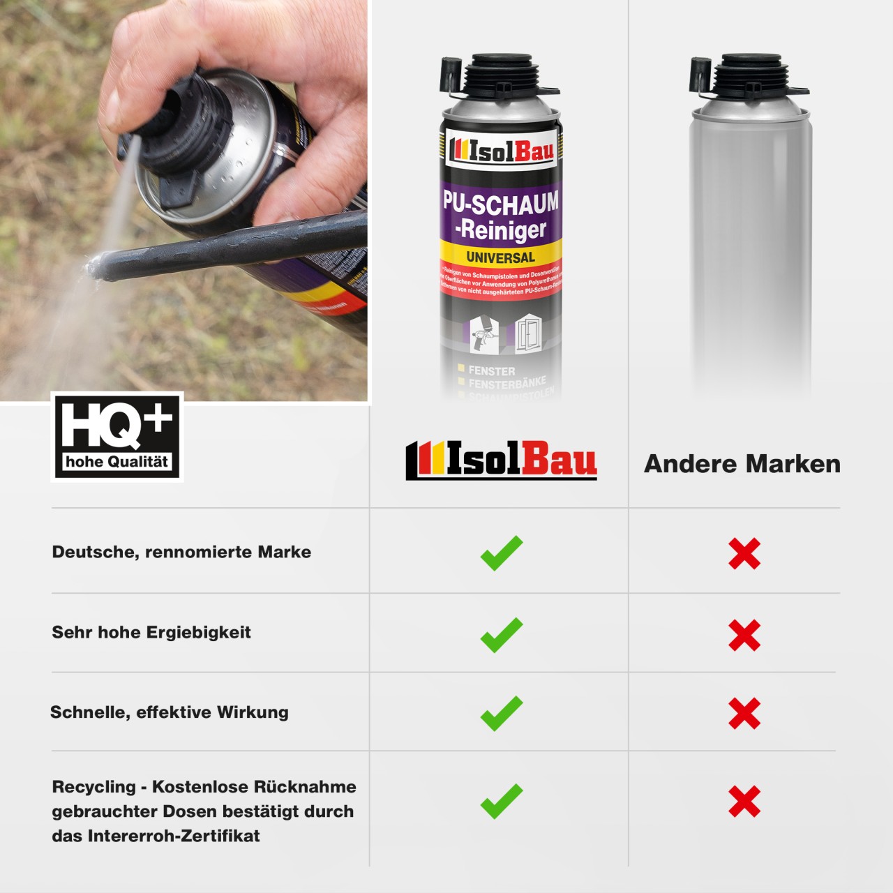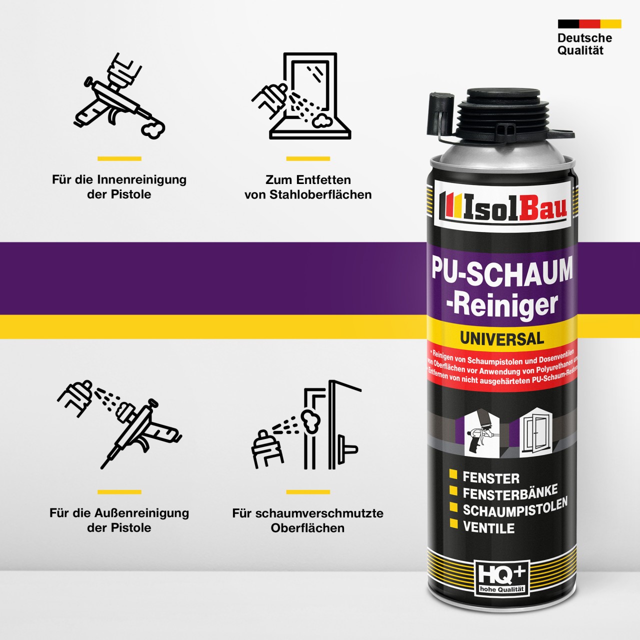 Der PU-SCHAUM-REINIGER ist ein modernes Reinigungsmittel für Oberflächen und Schaumpistolen (innen und aussen), die mit Polyurethanschaumstoffen frisch verschmutzt wurden. Auch ideal zum Entfetten von Stahloberflächen vor dem Auftragen von Silikonen und Polyurethanen. Reinigt schnell, rückstandsfrei und ohne klebende Oberfläche. Universalsprühkopf im Lieferanteil enthalten, dadurch ist eine Verwendung auch ohne PU-Pistole möglich um beispielsweise das Dosennventil oder das Adapterröhrchen zu reinigen. Das im Präparat verwendete Treibgas ist ein für die Ozonschicht unbedenkliches Gemisch.